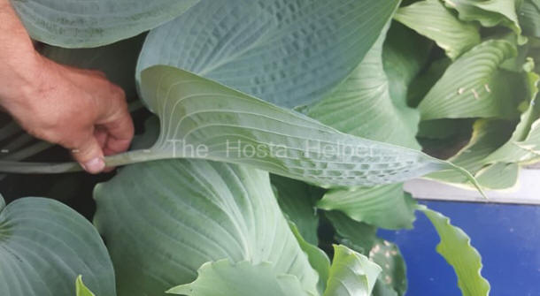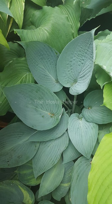 Originated by Jeroen Linneman of the Netherlands, this non-registered cultivar is a seedling of H. 'Mikawa-no-yuki'. It is a very upright growing, large size hosta with powdery blue-green colored foliage on the top and bottom. The leaves are slightly cupped and distinctly pointed at the end.