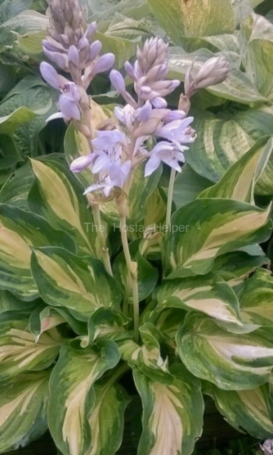 This non-registered cultivar of unidentified parentage was introduced by Jeroen Linneman of the Netherlands in 2017. The leaves are blue-green to green with creamy white medial (center) variegation. It bears medium lavender flowers.