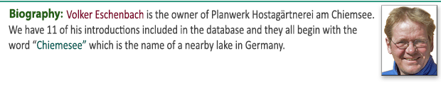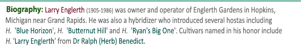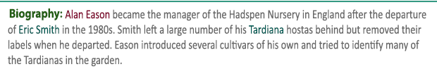 So far, we have 413 biographies but we are always looking to expand these listings and to keep them up to date. So, if you would like to recommend someone for inclusion or have a new or improved picture of someone already included please EMAIL US with their name and a brief description of his or her contributions  the World of Hostas. Thanks.