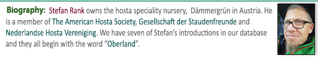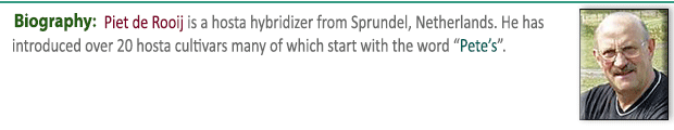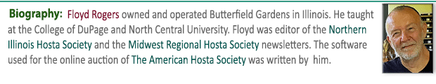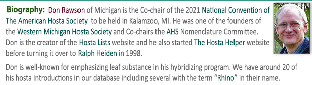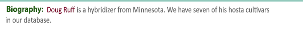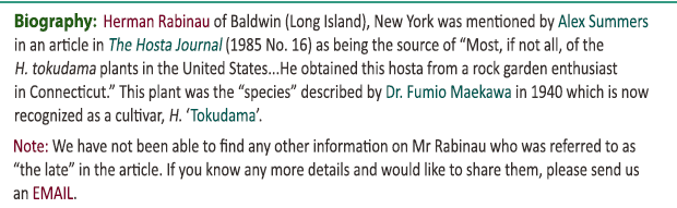 So far, we have 413 biographies but we are always looking to expand these listings and to keep them up to date. So, if you would like to recommend someone for inclusion or have a new or improved picture of someone already included please EMAIL US with their name and a brief description of his or her contributions  the World of Hostas. Thanks.