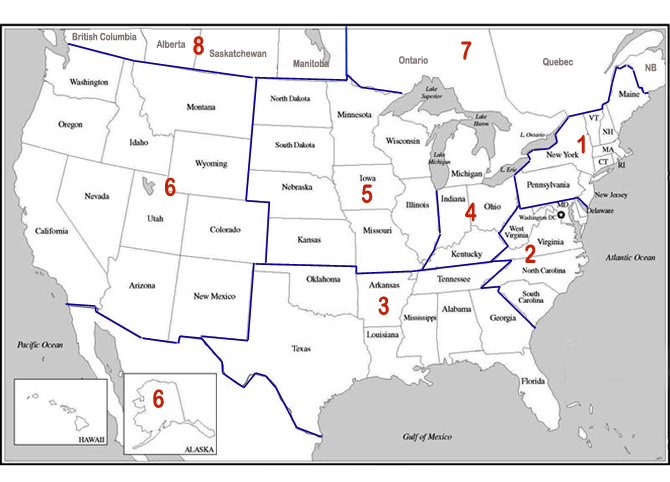 divide the U.S. and Canada into 8 regional organizations as shown on